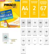 Etiquetas tipo Pimaco, no formato A4, em diversos tamanhos, impressas coloridas ou preto, com dados fixos ou variáveis.